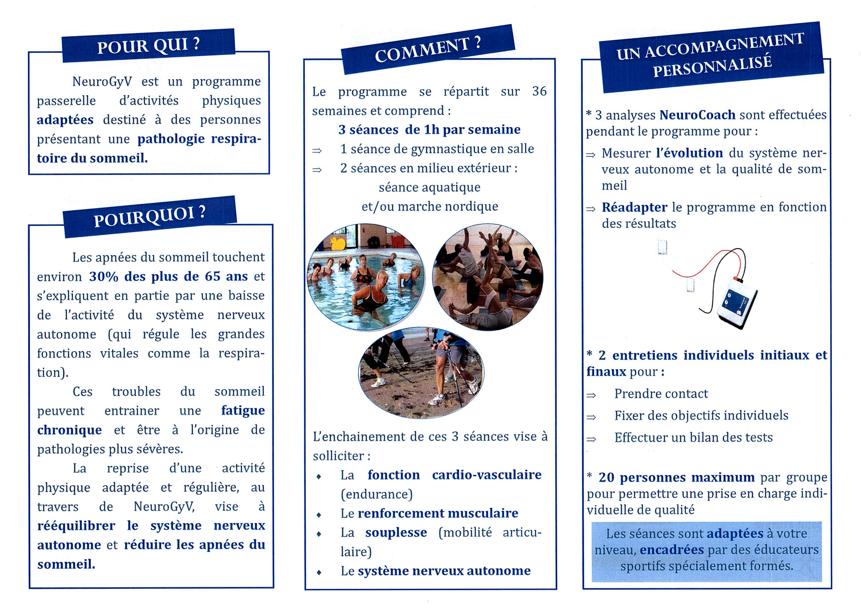 La reprise d'une activité physique adaptée et régulière, au travers de NeuroGyV, vise à rééquilibrer le système nerveux autonome et réduire les apnées du sommeil.